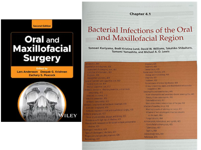 本書の「Bacterial infection (細菌感染症)」の章について、編集者Andersson教授から院長に依頼があり、院長の留学時代の上司・親友(Cardiff大学:Williams教授、Lewis名誉教授)、歯科大学時代の恩師(東京歯科大学口腔外科:柴原名誉教授)そして地域医療の友人(厚生連高岡病院歯科口腔外科:山下部長)と一緒に執筆しました。